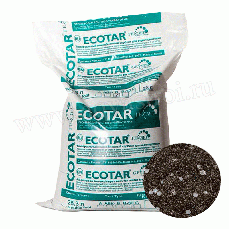 Загрузка: Экотар А ( Ecotar A ) –российский аналог загрузки EcoMix. Экотар А представляет собой комплекс из нескольких различных катиона-обменных, аниона-обменных и сорбционных материалов (смол), фильтрующие свойства и особенности каждого из которых, позволяют фильтру обеспечить единовременное обезжелезивание, деманганацию, снижение концентрации органических соединений и умягчение воды. При этом, количественное соотношение каждой смолы в наполнителе, объясняется её функциональной направленностью и способностью к поглощению того или иного загрязнения. В данном случае, Экотар А, ориентирован на удаление, как растворённого, так и органического железа, предполагая тем самым, в большей степени, очистку воды из не глубоких скважин и колодцев.