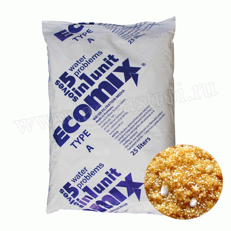 Загрузка: Многофункциональные загрузки Ecomix®А - тип фильтрующей загрузки, который можно использовать для комплексной очистки воды, как водопроводной так и артезианской с одновременным умягчением, удалением железа, марганца, аммония и органических соединений природного происхождения. Ионообменный материал эффективно снижает жесткость (не более 25мг/л), удаляет железо (не более 10мг/л) и марганец (не более 2мг/л) в независимости от концентрации органических соединений (2-8 мгО2/л), уровня рН (5,0-9,0) и минерального состава исходной воды (солесодержание 100-4000).