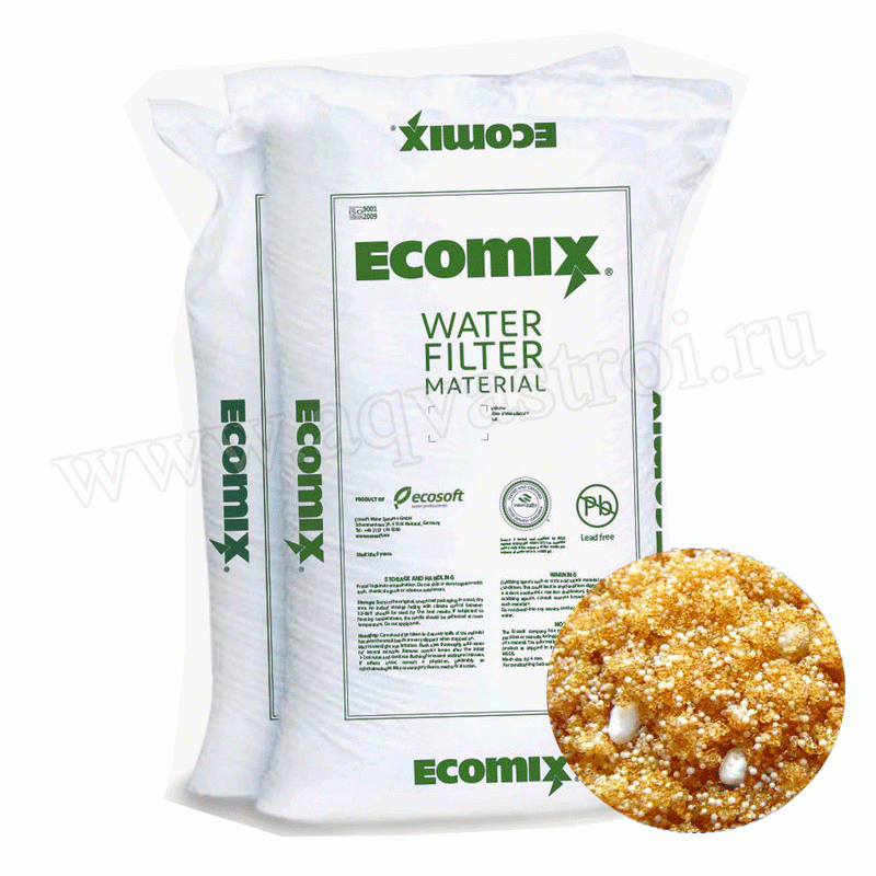 | Описание системы: | Многофункциональные загрузки Ecomix®Р - тип фильтрующей загрузки, который можно использовать для комплексной очистки воды, как водопроводной так и артезианской с одновременным умягчением, удалением железа, марганца, аммония и органических соединений природного происхождения. Ионообменный материал эффективно снижает жесткость (не более 25мг/л), удаляет железо (не более 10мг/л) и марганец (не более 2мг/л) при концентрации органических соединений в исходной воде не ниже 2 мгО2/л (2-3 мгО2/л). |