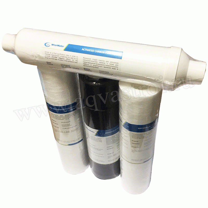 Комплектация: Картридж седиментный /5 мкм/ 2,5"х10"; Картридж с гранулированным углем 2.5"х10"; Картридж, пост-фильтр WiseWater, QC; Картридж с прессованным углем /10 мкм/ 2.5"х10".